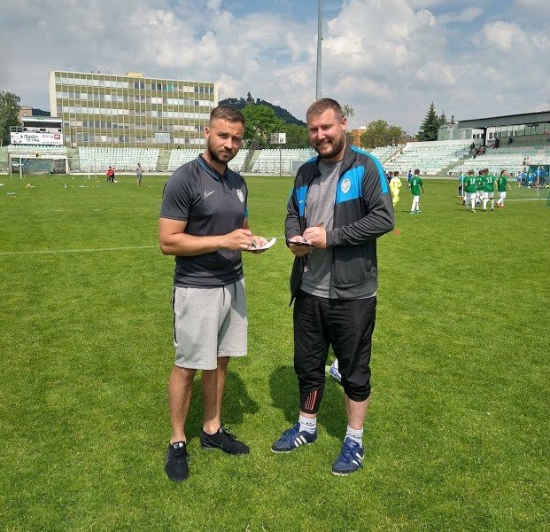Ladislav Rameš v rozhovoru s Davidem Duchkem na stadionu FSJM v Mostě.