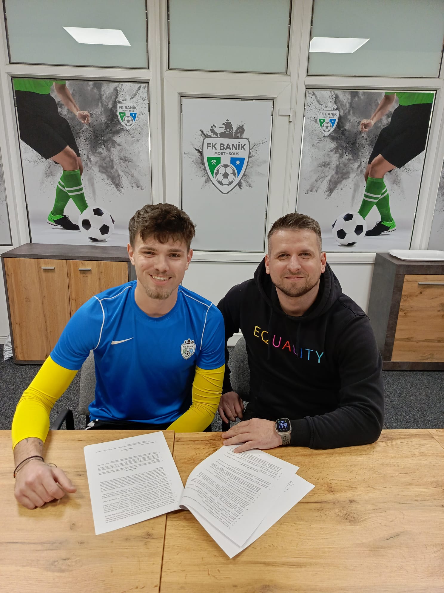 Patrik Kolář a sportovní manažer Petr Glaser při podpisu půlroční smlouvy s Baníkem.