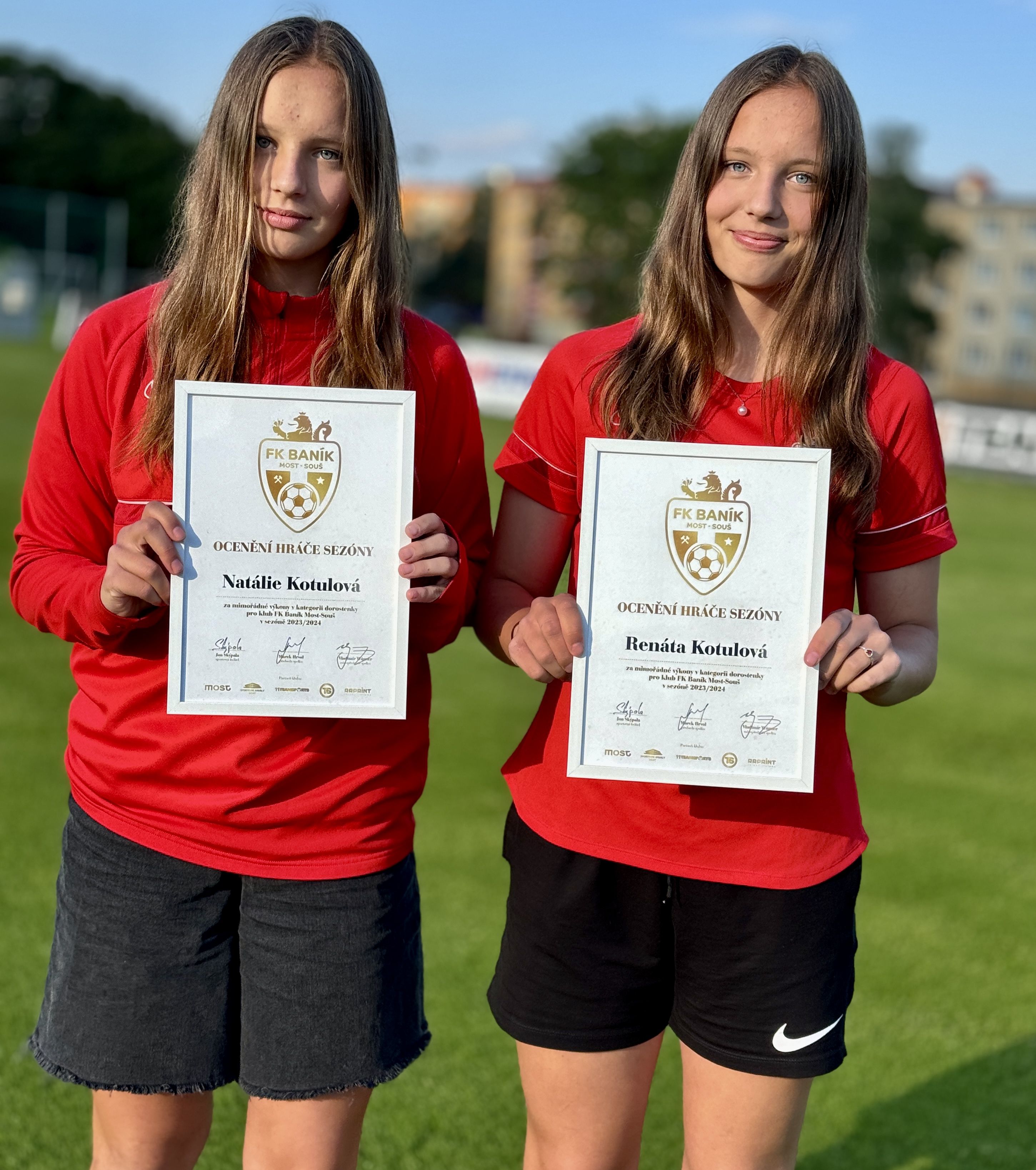 Holky fotbalu mají plnou hlavu. Obzvlášť teď, když se mosteckým dorostenkám daří ve druhé lize a jsou na prvním místě tabulky, tak i Ženám za které také nastupují a jsou také první v tabulce divizní soutěže. „Jsem ráda, že se nám daří, jsem kapitánkou dorostenek. Máme skvělý tým. Jsem pyšná , že si můžeme zahrát se ségrou i v A týmu Žen. Prožíváme teď krásný období“, uvedla upovídanější z dvojčat Natálie.